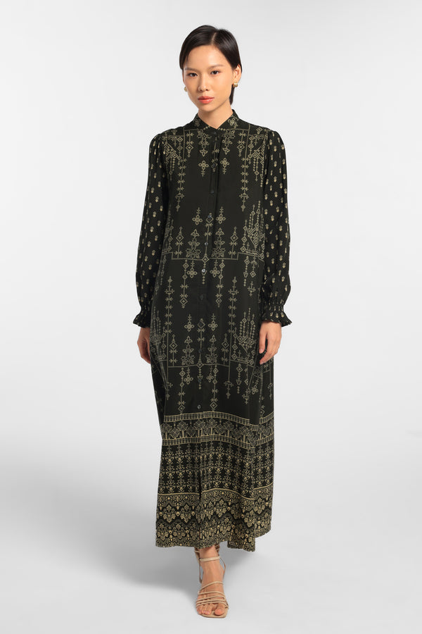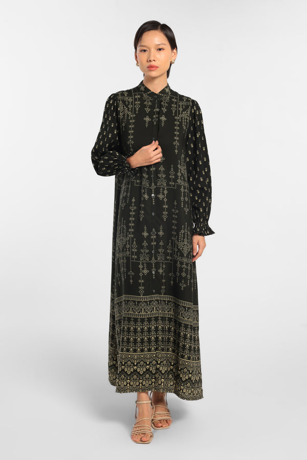 Gamis Printed dengan Motif Eksklusif dengan detail smock rows dibagian lengan yang dirancang dalam komposisi warna. Green Dark lembut untuk tampilan Raya yang anggun dan minimal. Potongan rapi dan siluet nyaman menjadikan gamis ini pilihan tepat untuk momen silaturahmi bersama keluarga