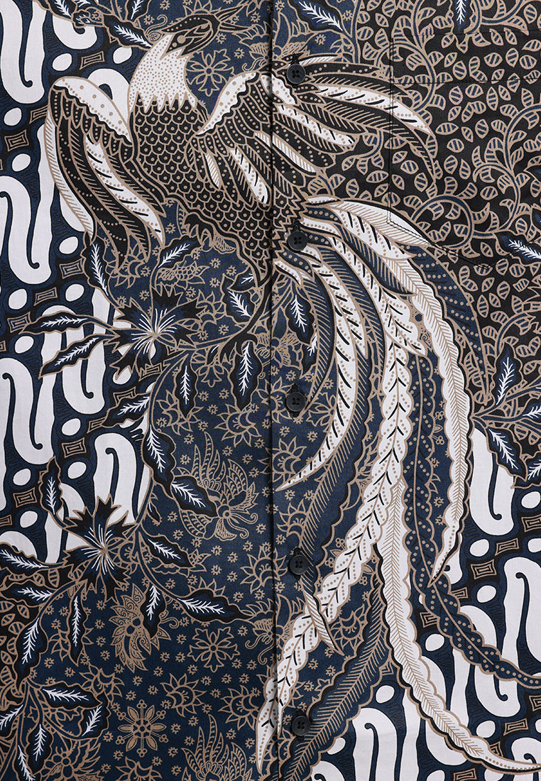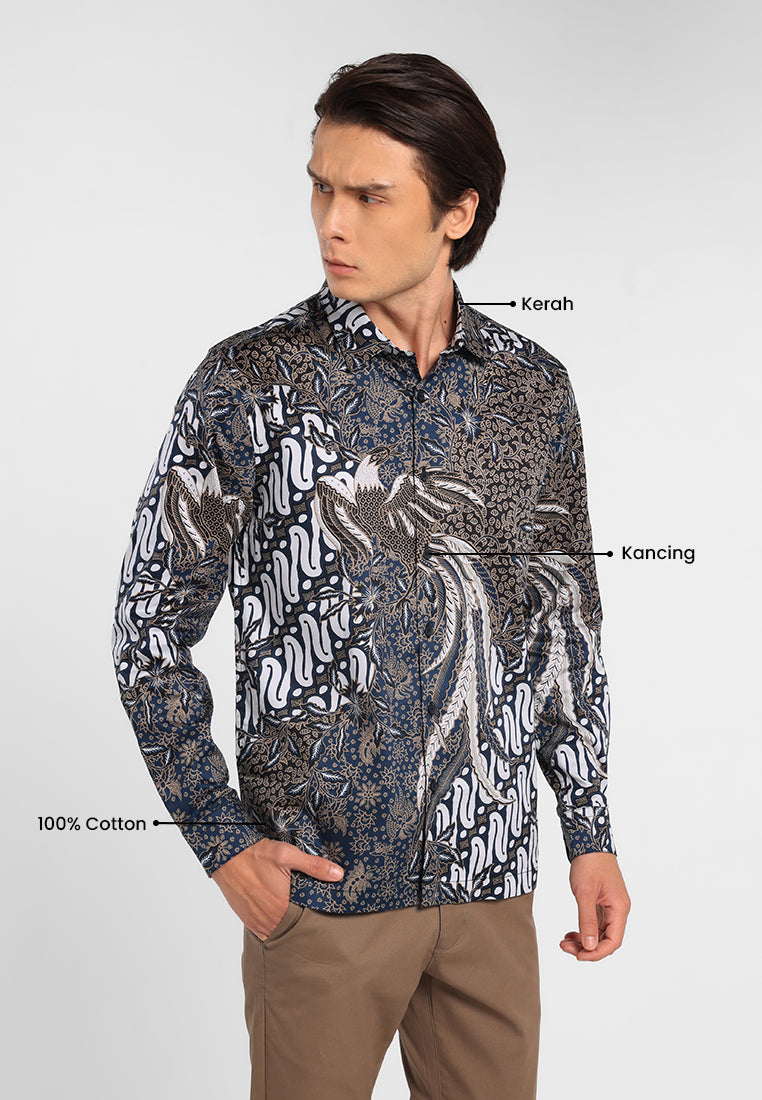Kemeja batik lengan panjang yang memiliki motif burung phoenix yang melambangkan keabadian dan kebangkitan, dipadukan dengan motif parang yang sarat makna keteguhan dan keberanian. Dengan warna dasar hitam dan navy yang elegan, kemeja ini memancarkan kesan gagah, berwibawa, dan penuh karakter.