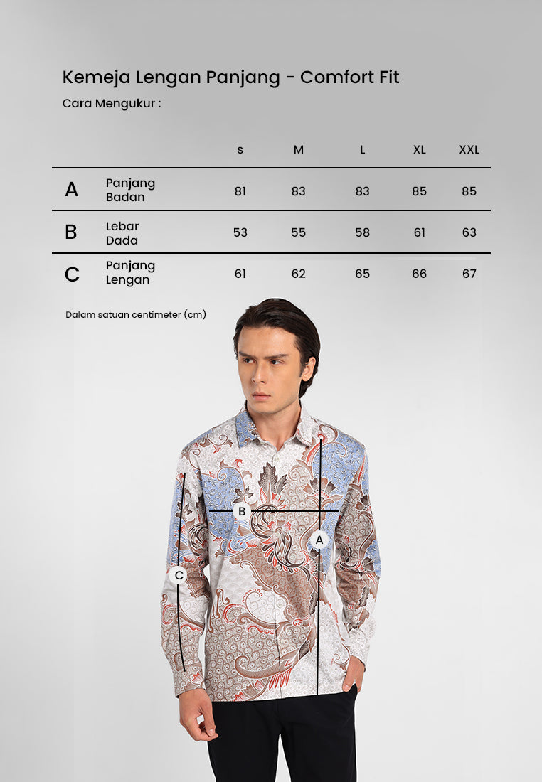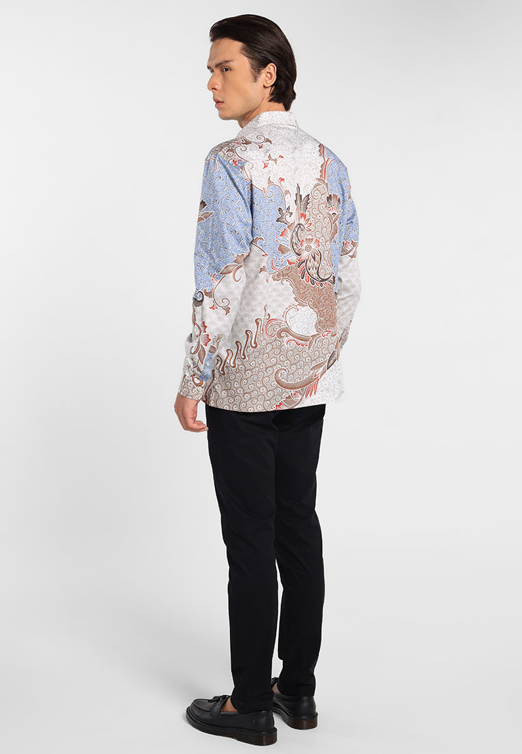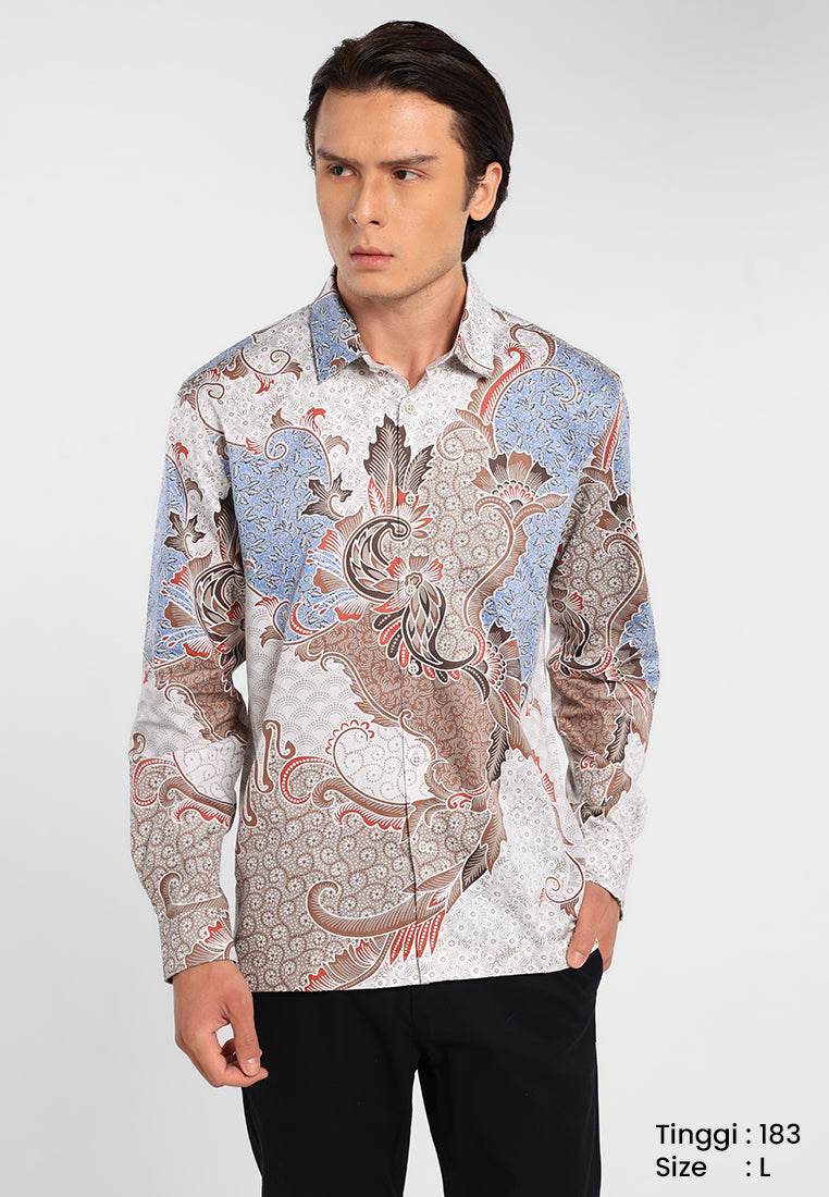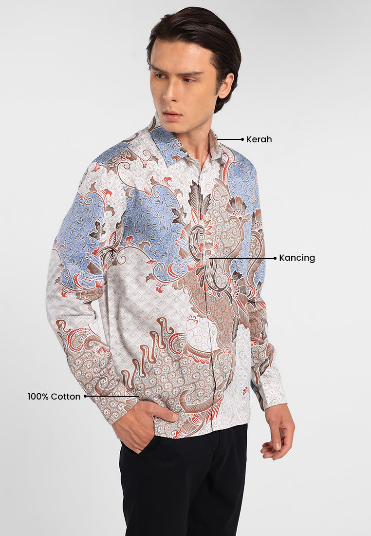 Kemeja batik lengan panjang dengan motif lung-lungan floral klasik yang menampilkan rangkaian sulur, daun, dan bunga stilisasi khas Nusantara dengan komposisi seimbang. Detail isen-isen tradisional memperkaya tampilan visual, sementara perpaduan warna abu-abu, biru keabu-abuan, dan aksen hangat menciptakan kesan elegan, dewasa, dan berkelas. Desain ini menghadirkan nuansa heritage dan ideal untuk penampilan formal maupun semi-formal dengan karakter eksklusif dan timeless.