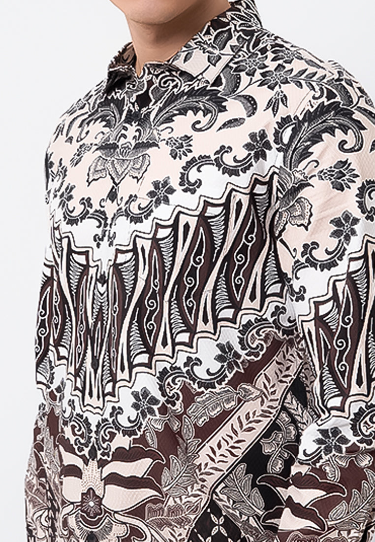 Kemeja batik ini menghadirkan motif batik parang modern kontemporer, dipadukan dengan ornamen batik lainnya yang menciptakan tampilan harmonis dan elegan. Dengan fitting modern fit dan desain bawah rata, kemeja ini memberikan kesan yang rapi serta nyaman dipakai sepanjang hari.