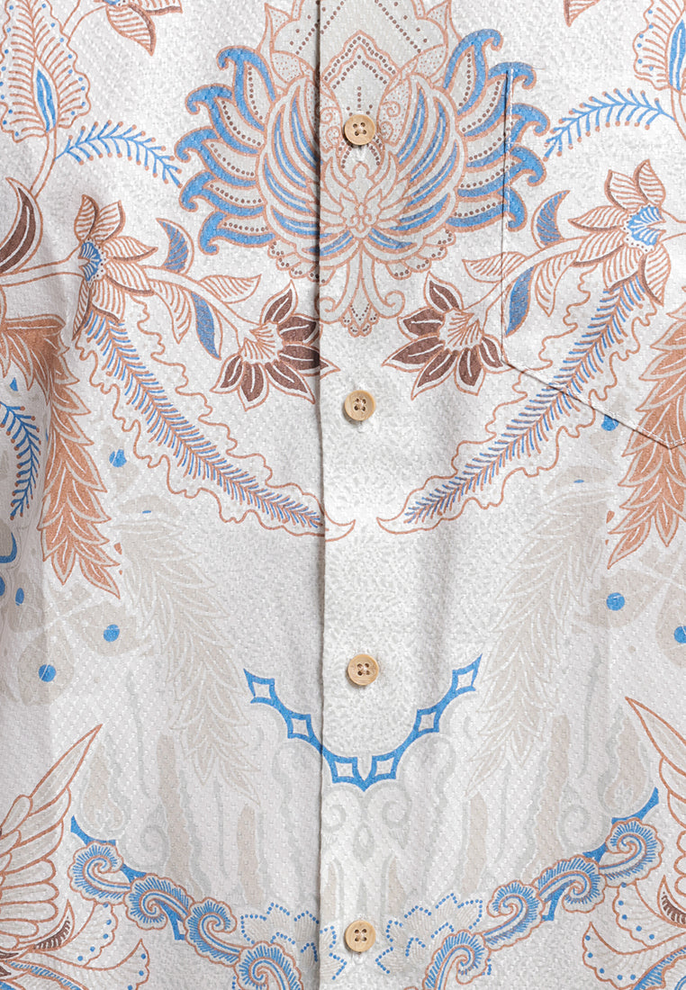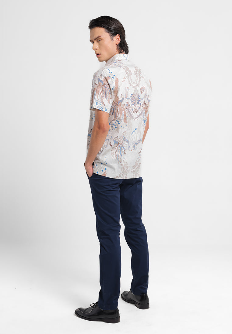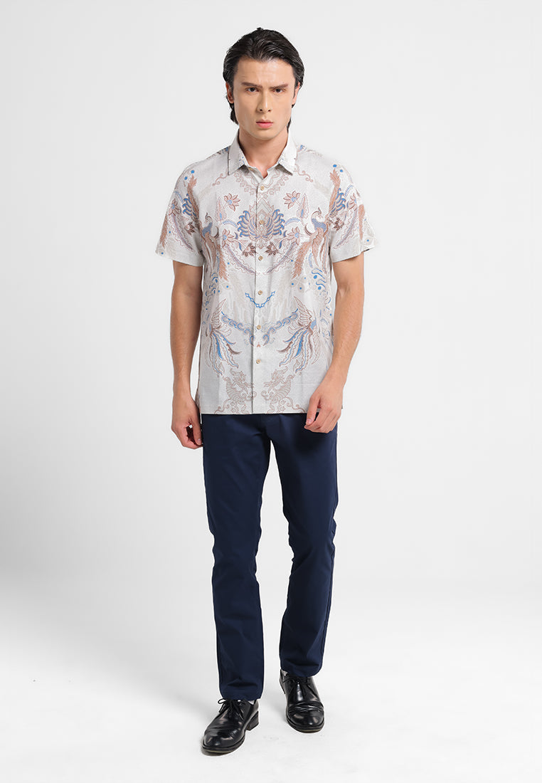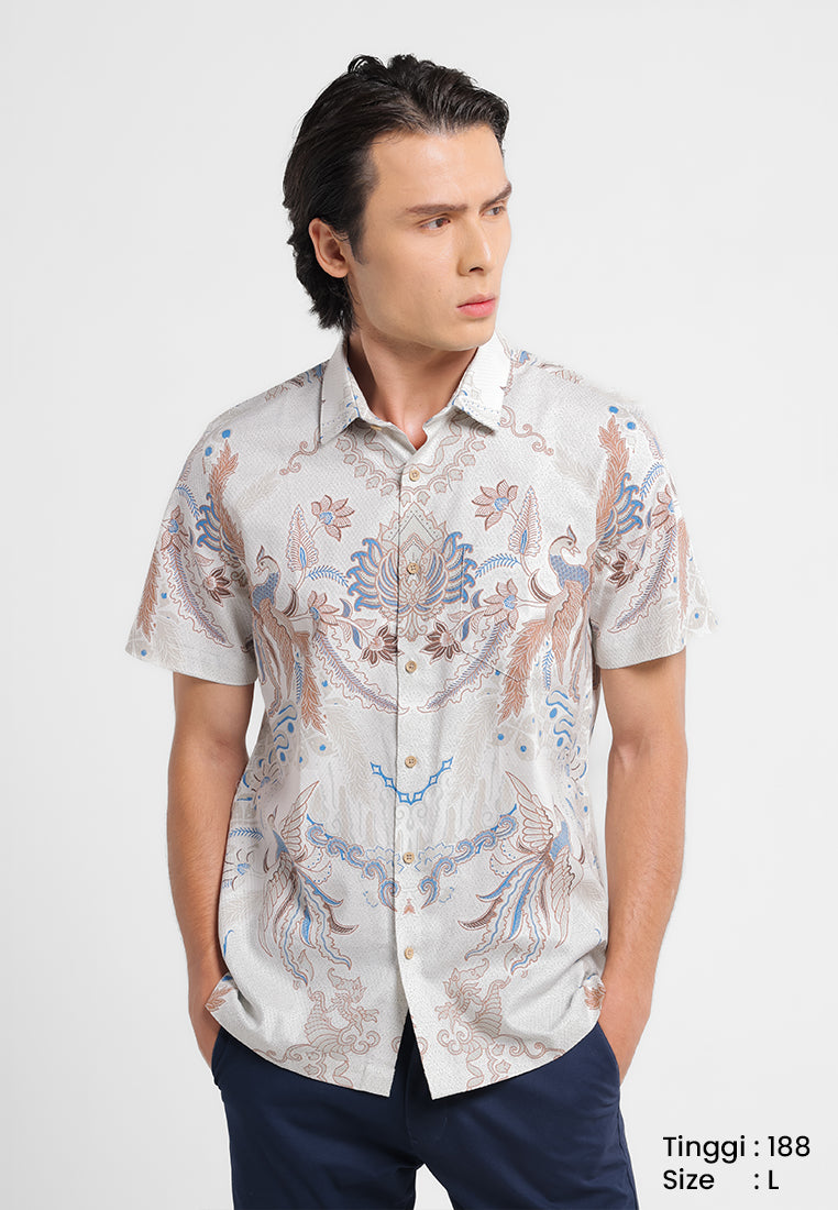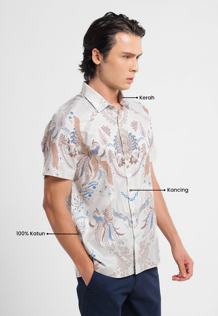 Tampil berkelas dengan kemeja batik lengan pendek bermotif burung hong yang melambangkan kemuliaan, keanggunan, dan keberuntungan. Desain simetris berpadu dengan ornamen floral yang detail, menciptakan tampilan modern namun tetap sarat filosofi.