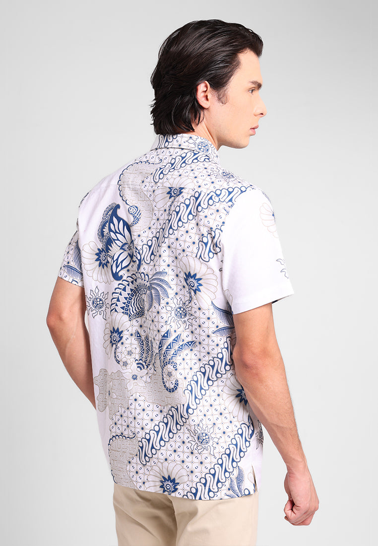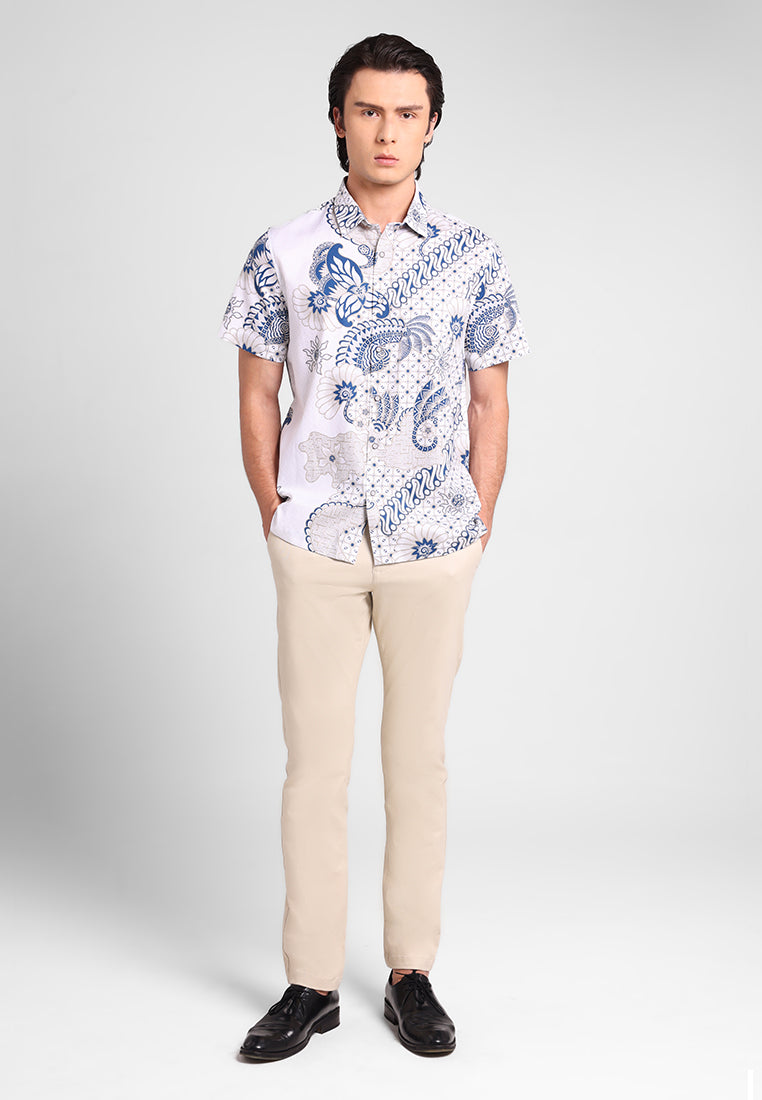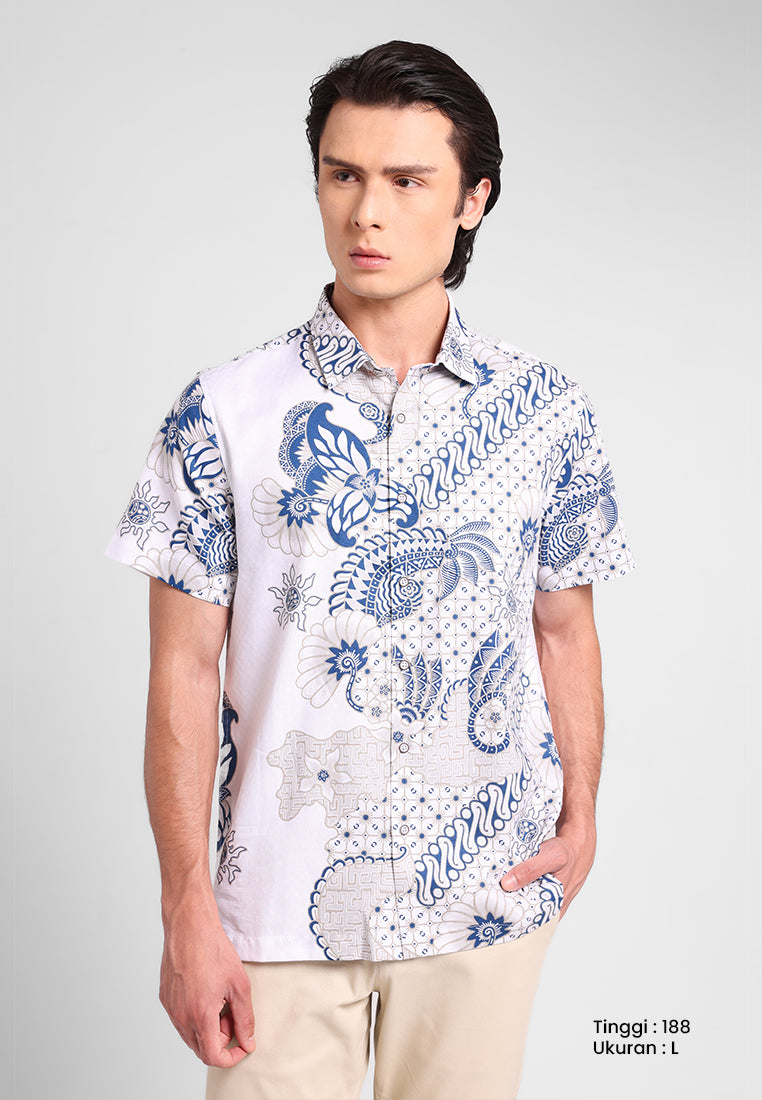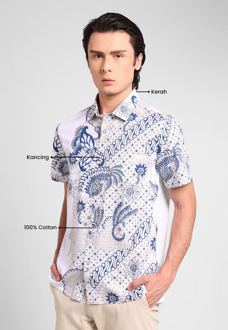 Kemeja batik lengan pendek ini menampilkan motif elegan bunga teratai yang melambangkan kesucian, ketenangan, dan kebijaksanaan. Desain asimetris dengan perpaduan ornamen floral dan geometris memberi sentuhan unik dan modern tanpa meninggalkan nuansa tradisi.