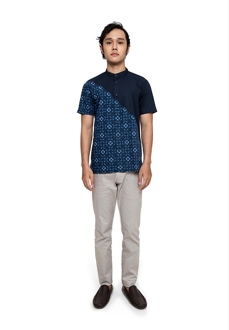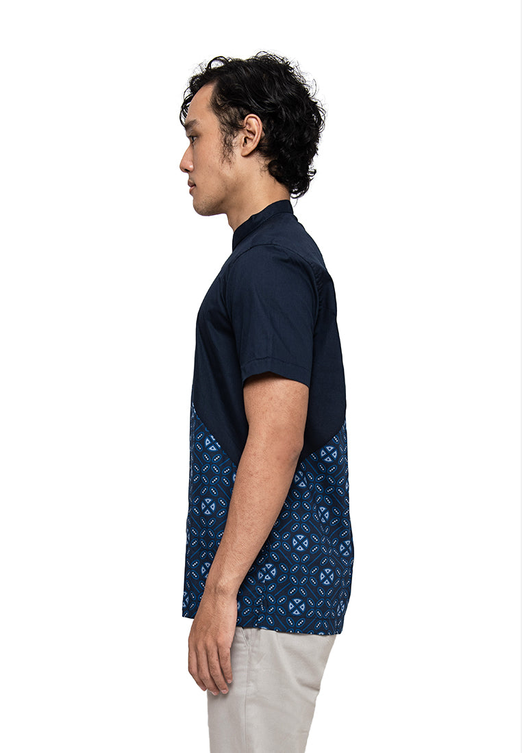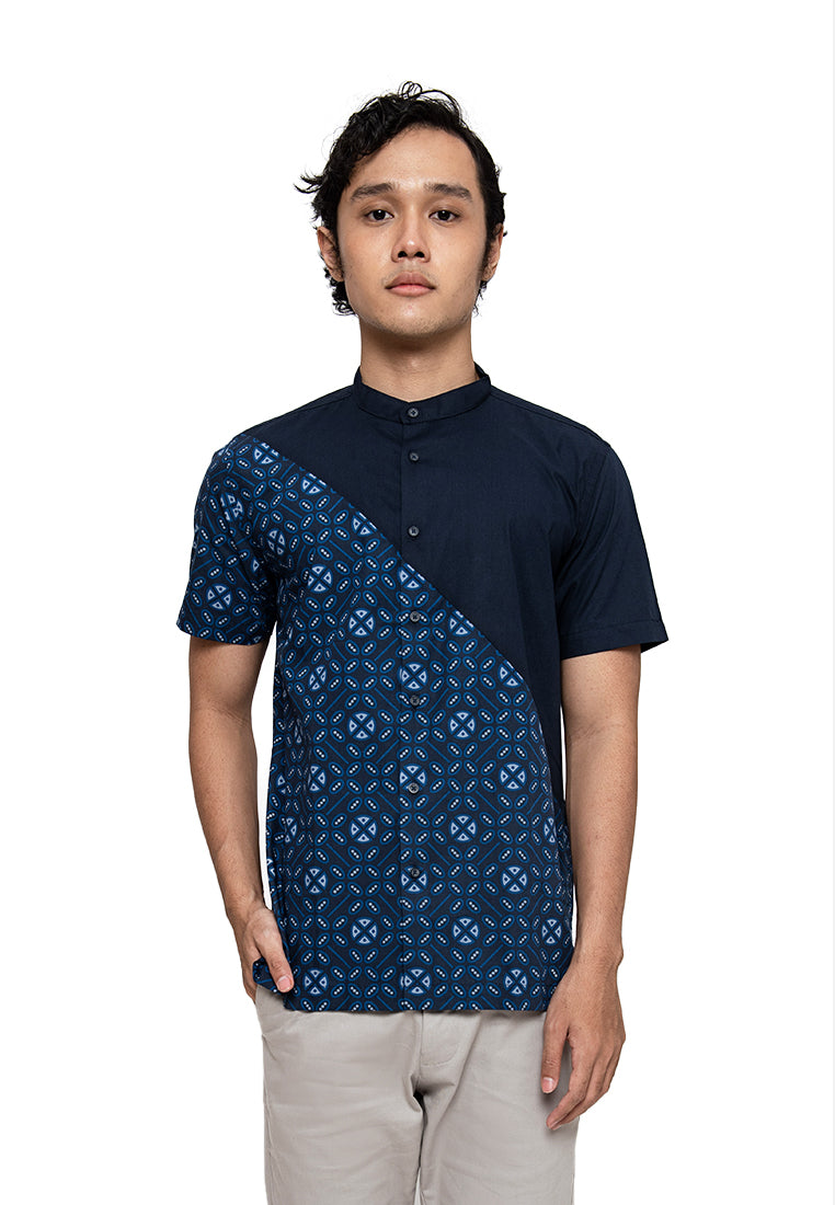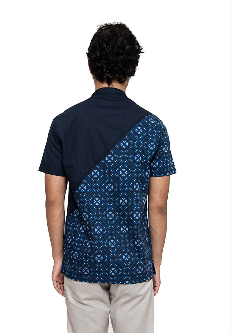 KEMEJA BATIK LENGAN PENDEK YANG DIPRINT DIATAS KAIN POPLIN. DENGAN KOMBINASI CUT & SEW PRINT DAN SOLID COLOR MEMBUAT KEMEJA INI TERLIHAT LEBIH MODERN DAN TRENDI.