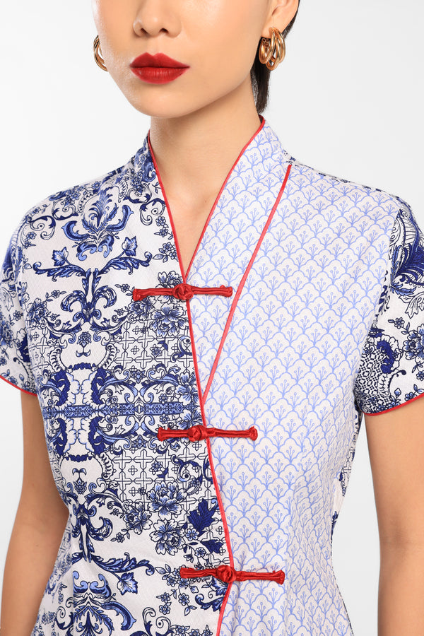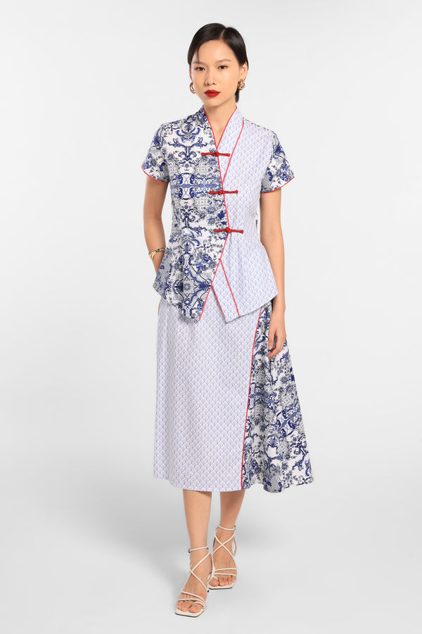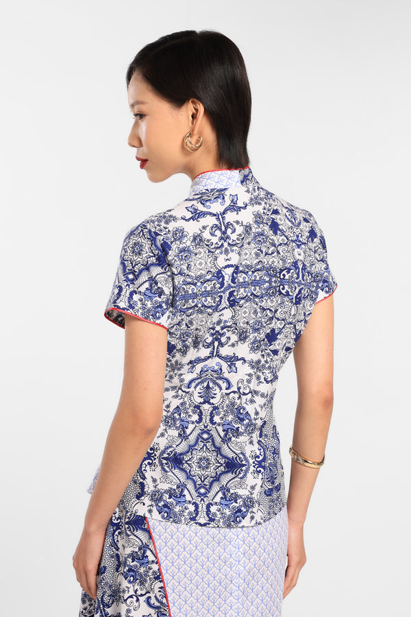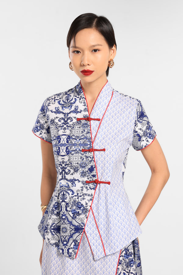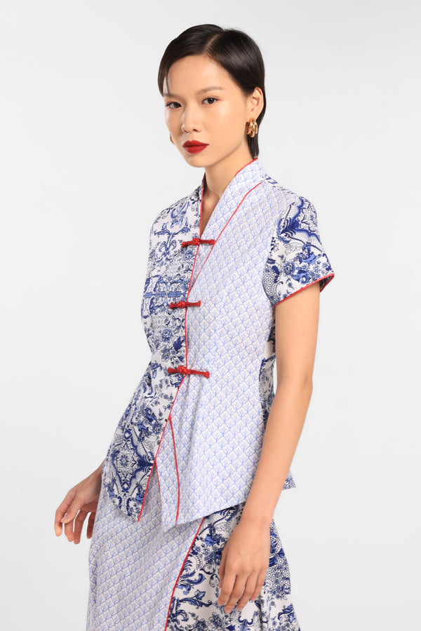 Blouse dengan siluet ketat atau pas di badan dibuat dari katun dobby yang nyaman dipakai dan motif special CNY motif guci china dan kombinasi motif bunga kecil dengan nuansa warna biru dan kombinasi bisban merah yang cantik. Dapat dipakai untuk acara formal.