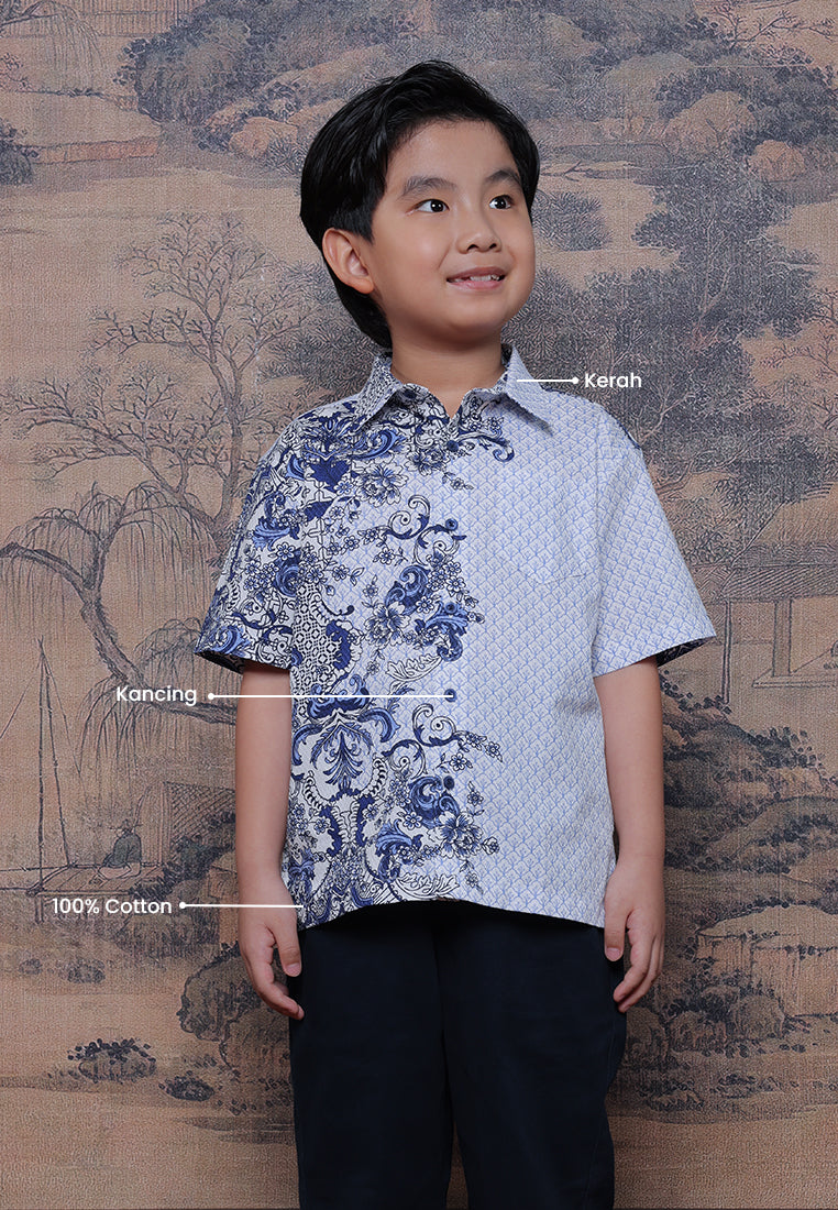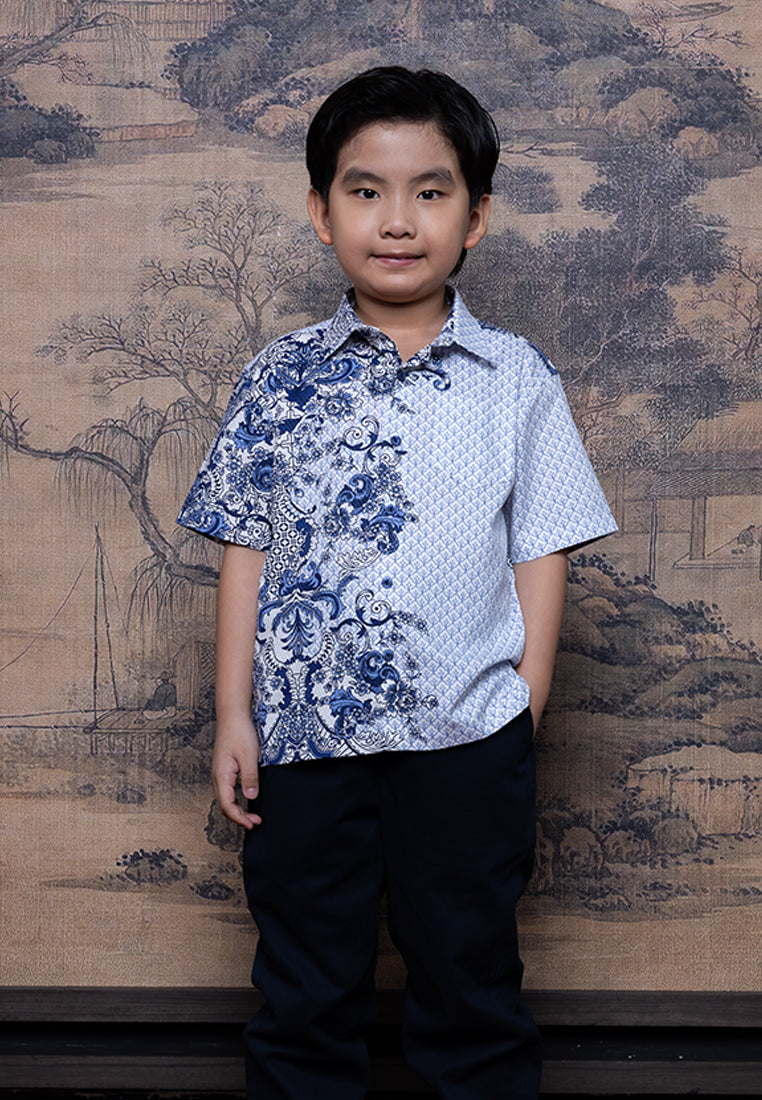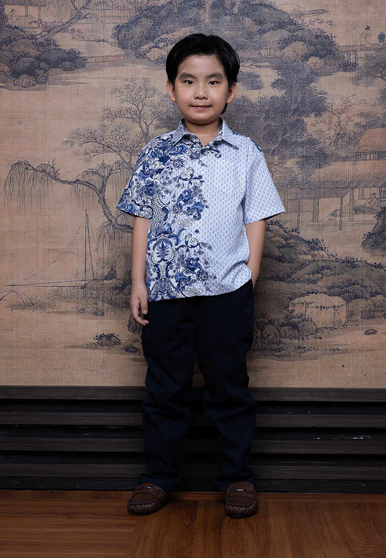 Kemeja anak dengan motif oriental biru putih yang clean dan modern. Terbuat dari bahan Dobby Print 100% Cottonyang adem, lembut, dan nyaman dipakai. Cutting regular fit membuat si kecil tetap bebas bergerak saat kumpul keluarga di Chinese New Year.