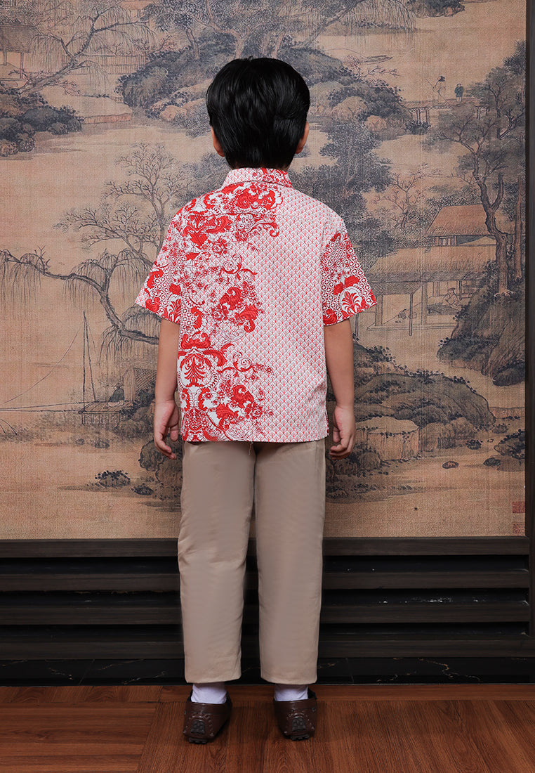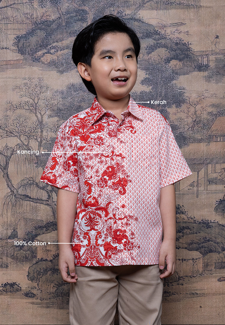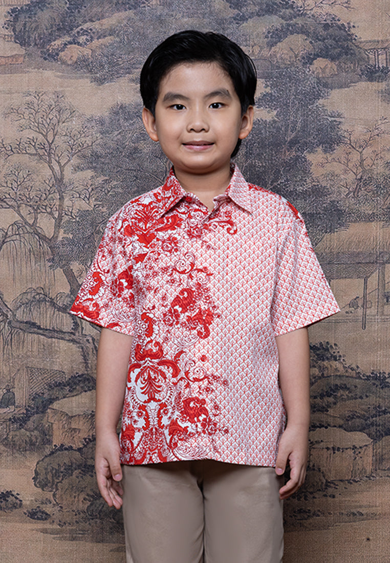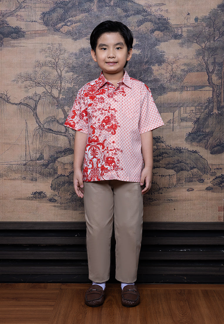 Kemeja anak dengan motif oriental merah putih yang clean dan modern. Terbuat dari bahan Dobby Print 100% Cotton yang adem, lembut, dan nyaman dipakai. Cutting regular fit membuat si kecil tetap bebas bergerak saat kumpul keluarga di Chinese New Year.