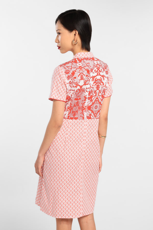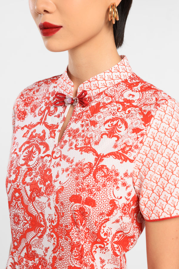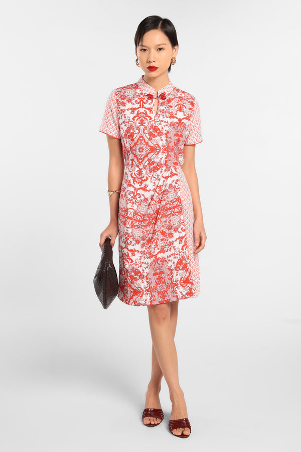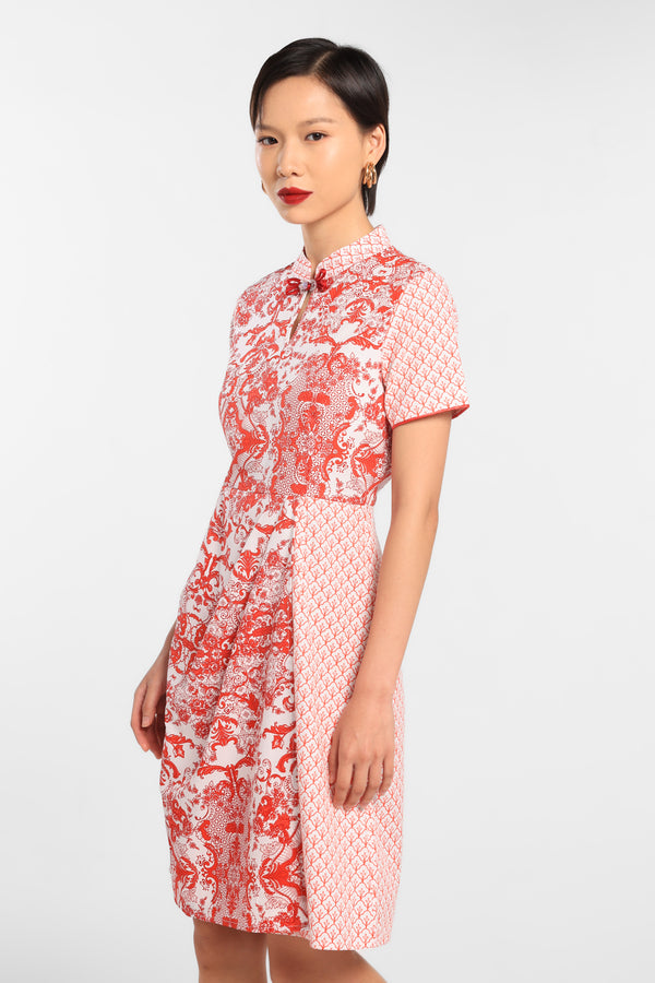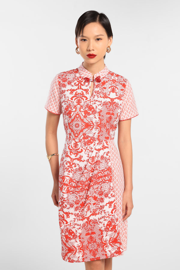Dress dengan siluet ketat atau pas di badan dibuat dari katun dobby yang nyaman dipakai dan motif special CNY motif guci china dan kombinasi motif bunga kecil dengan nuansa warna merah cerah dan kombinasi bisban merah yang cantik. Dapat dipakai untuk acara formal.
