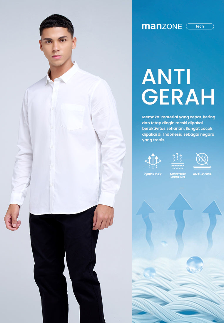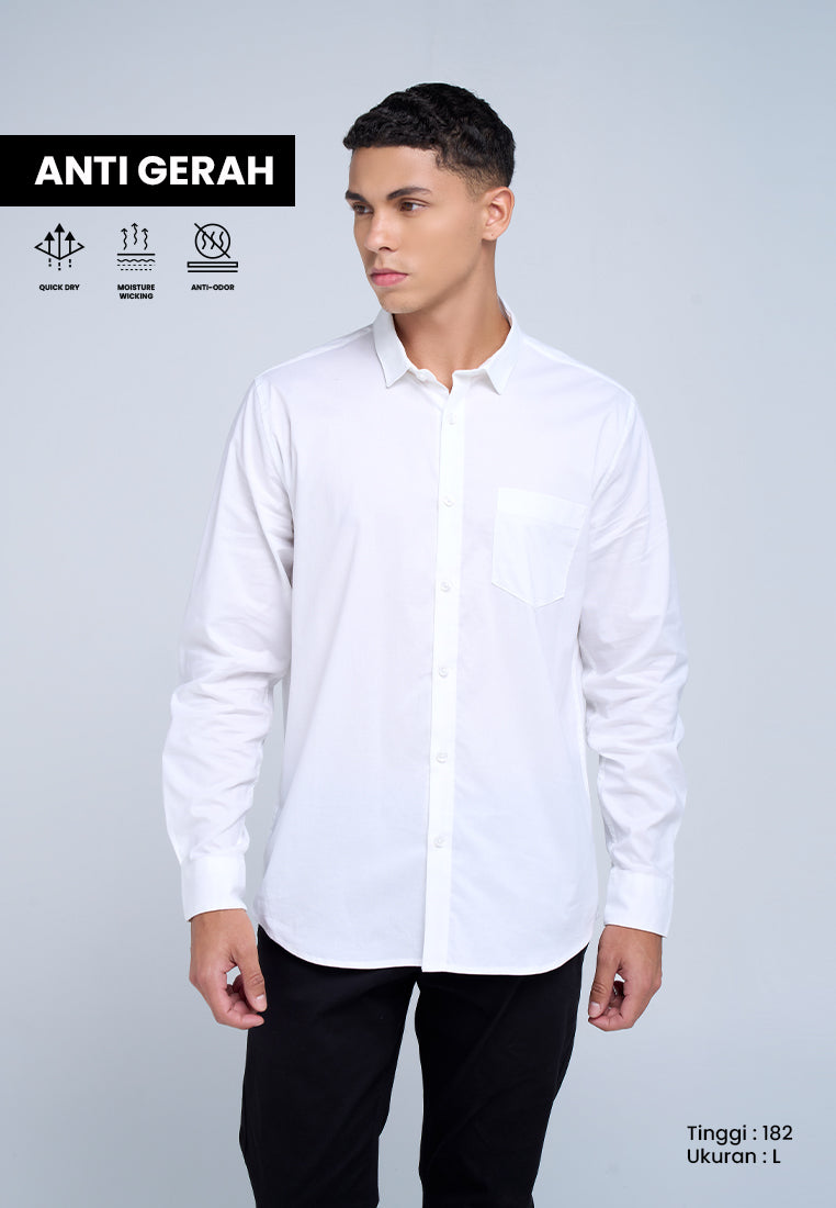 Kemeja lengan panjang ini terbuat dari bahan cotton spandex dengan komposisi 97% katun dan 3% spandex, yang memberikan kenyamanan dari katun serta sedikit elastisitas berkat spandex, memastikan fleksibilitas dan kebebasan bergerak. Kemeja ini dilengkapi dengan teknologi quick dry, moisture wicking, dan anti odor, yang dikenal dengan sebutan "Anti Gerah," menjadikannya pilihan sempurna untuk cuaca panas atau aktivitas tinggi, karena mampu menjaga kesegaran sepanjang hari.
