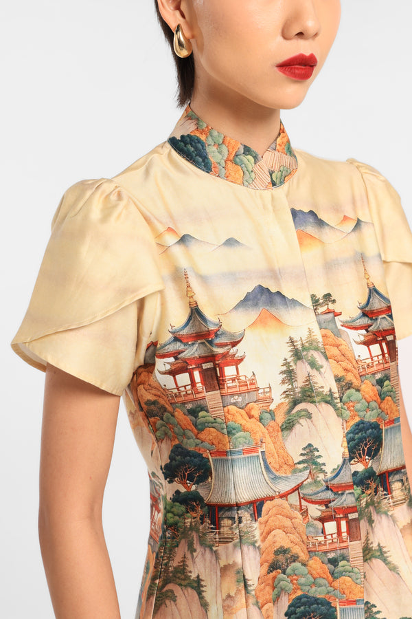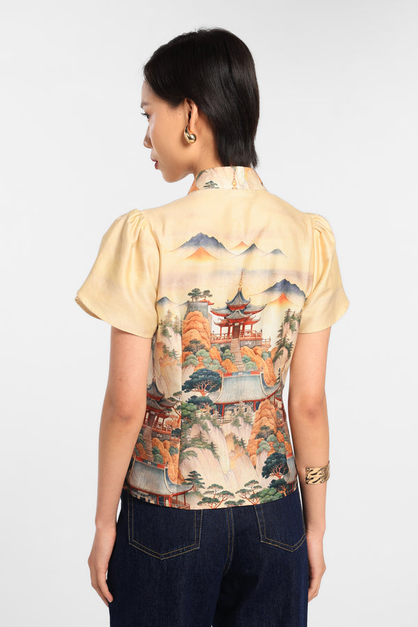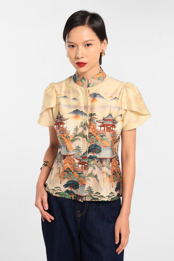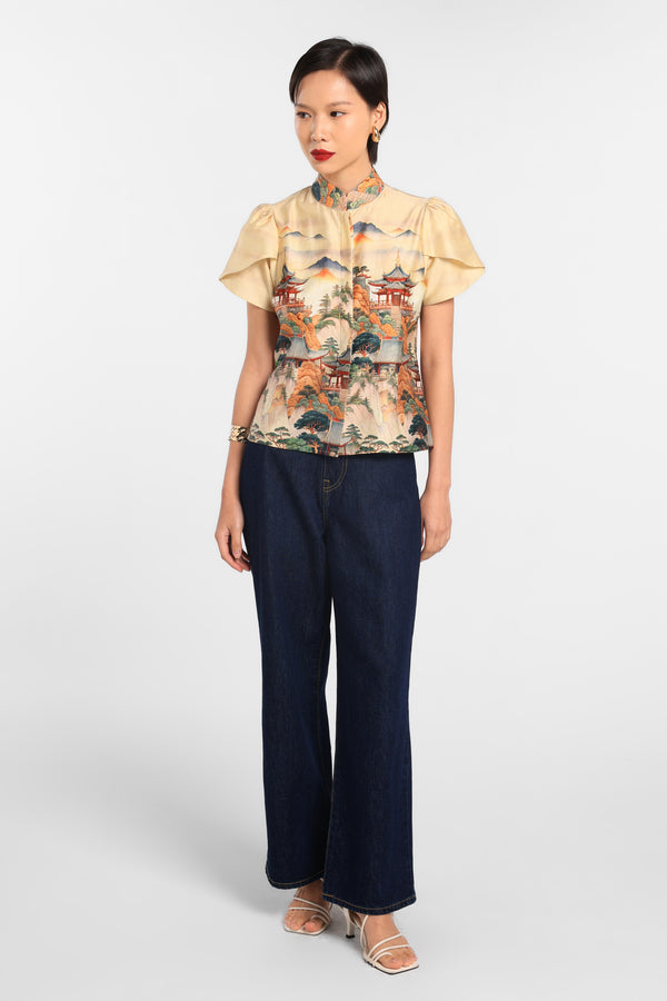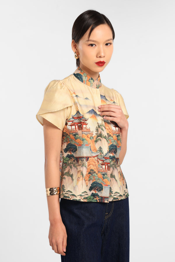 Blouse fitted lengan pendek dibuat dari bahan katun satin yang nyaman dipakai dan motif special CNY lukisan pedesaan china dengan nuansa warna beige yang cantik. Detail lengan tulip mempercantik blouse ini. Dapat dipakai dengan bawahan rok ataupun celana polos.