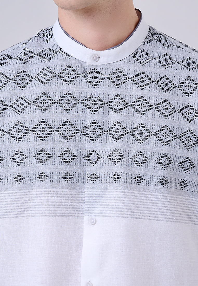 Motif dobby horizontal menambahkan tekstur halus pada kain, menciptakan detail visual yang menarik. Nuansa warna putih ke abu-abuan memberikan kesan bersih dan modern, membuatnya sangat cocok untuk perayaan Lebaran yang penuh kesucian dan kebersamaan.