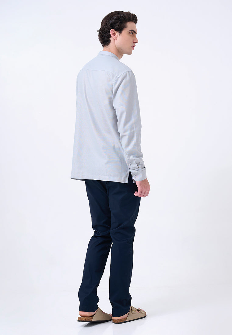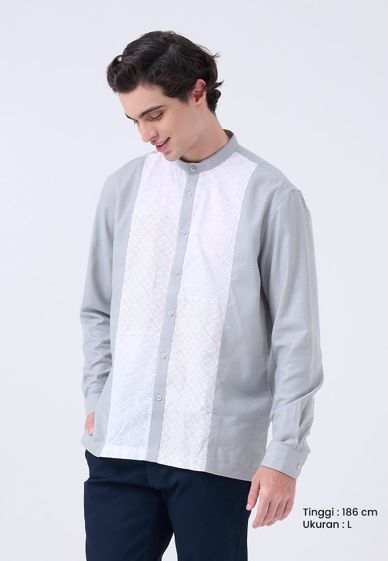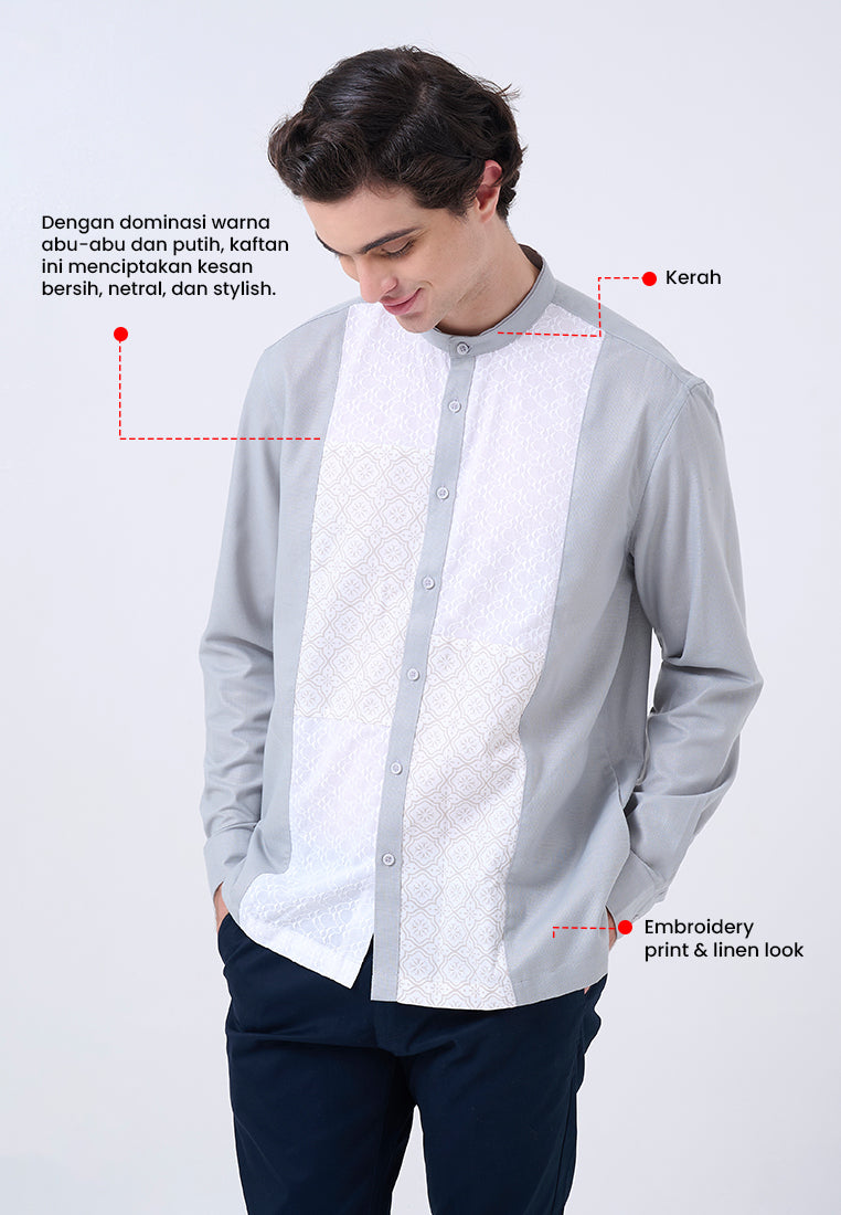 Dengan dominasi warna abu-abu dan putih, kaftan ini menciptakan kesan bersih, netral, dan stylish. Dilengkapi dengan kantong di bagian kiri dan kanan untuk fungsionalitas tambahan, serta slit di sisi kiri dan kanan yang memberikan kenyamanan dan fleksibilitas gerak.