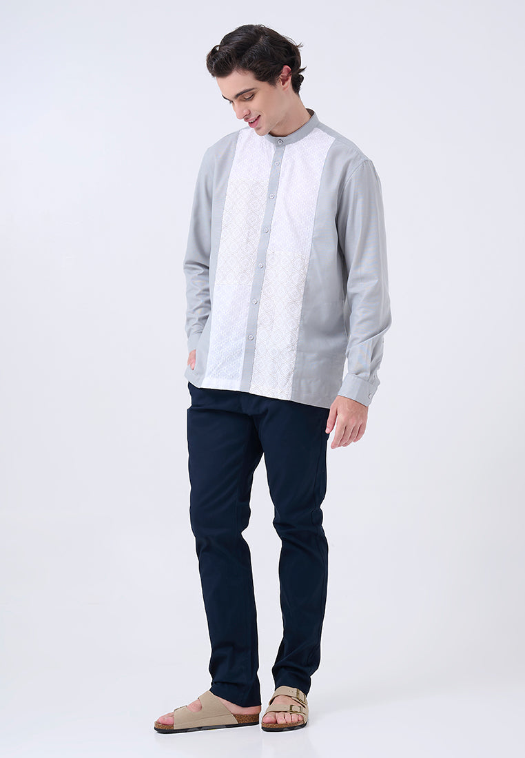 Kaftan lengan panjang ini memadukan bahan solid dengan full embroidery dan aksen cut and sew print dalam desain vertikal yang unik. Sentuhan asimetris di sisi kanan dan kiri memberikan tampilan modern yang berbeda namun tetap elegan.