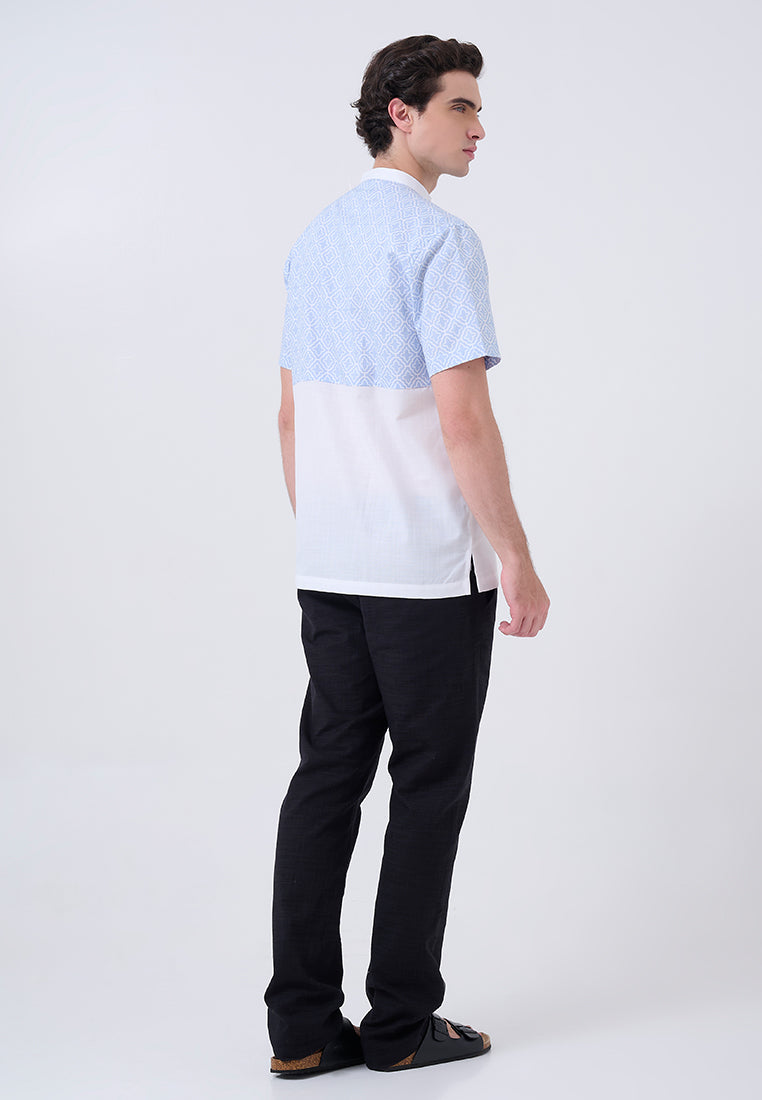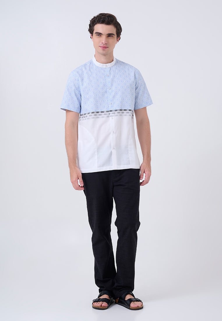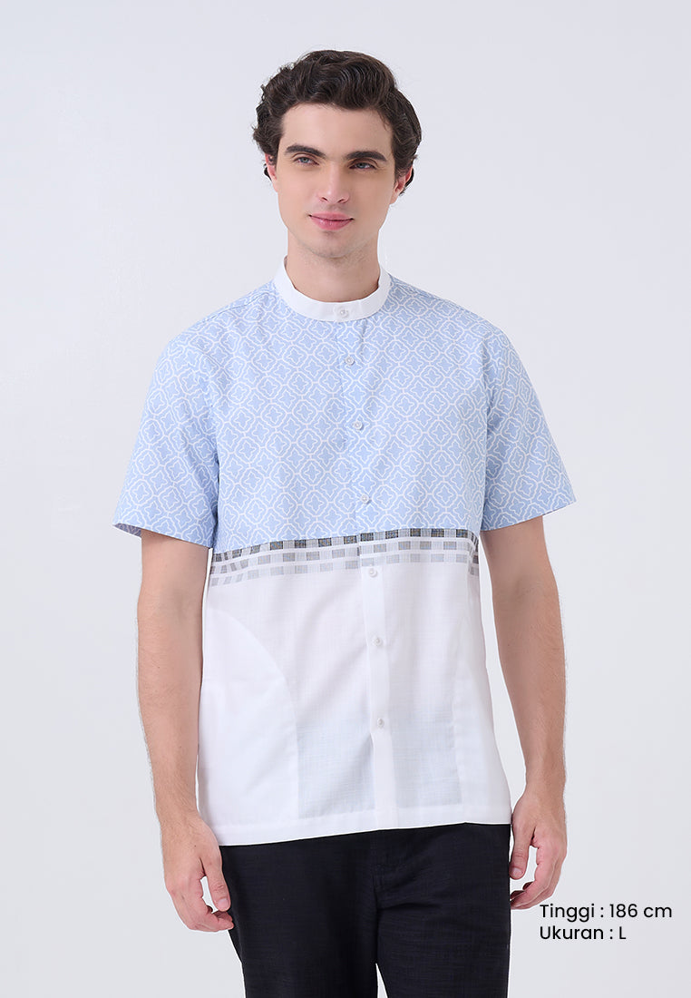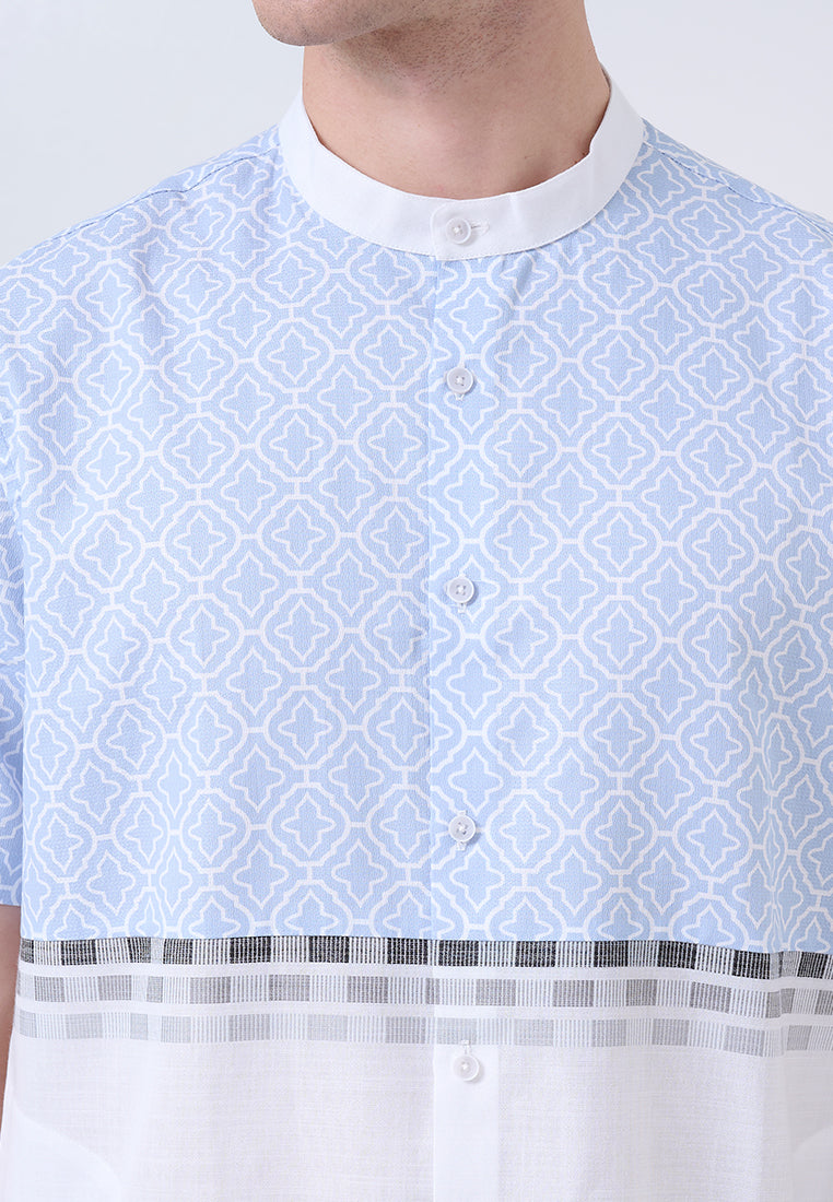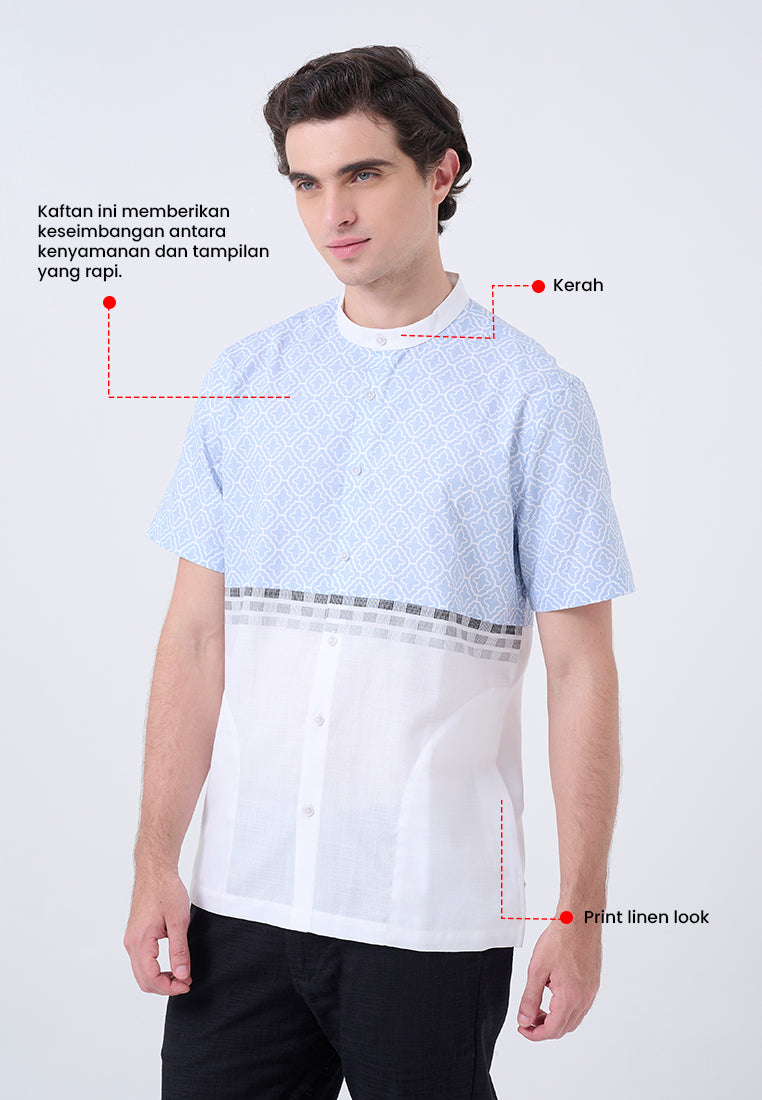 Kaftan lengan pendek ini memadukan printing dan border linen look, menciptakan tampilan yang segar dan modern. Dengan nuansa biru muda dan putih, kaftan ini cocok untuk tampilan santai yang tetap elegan.