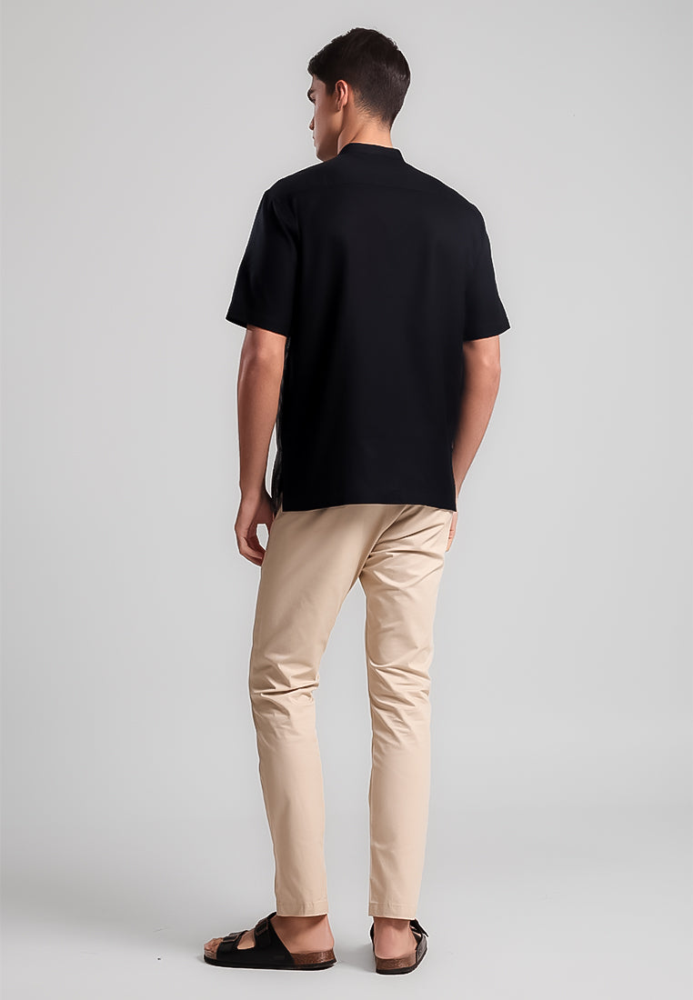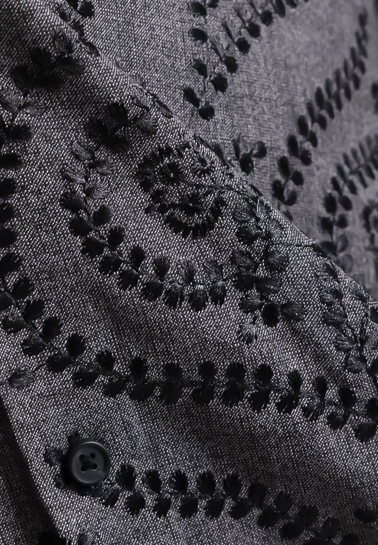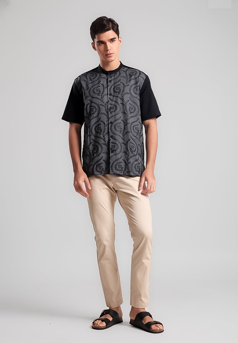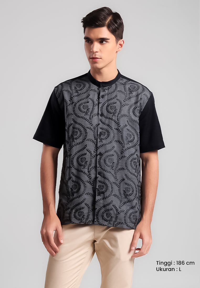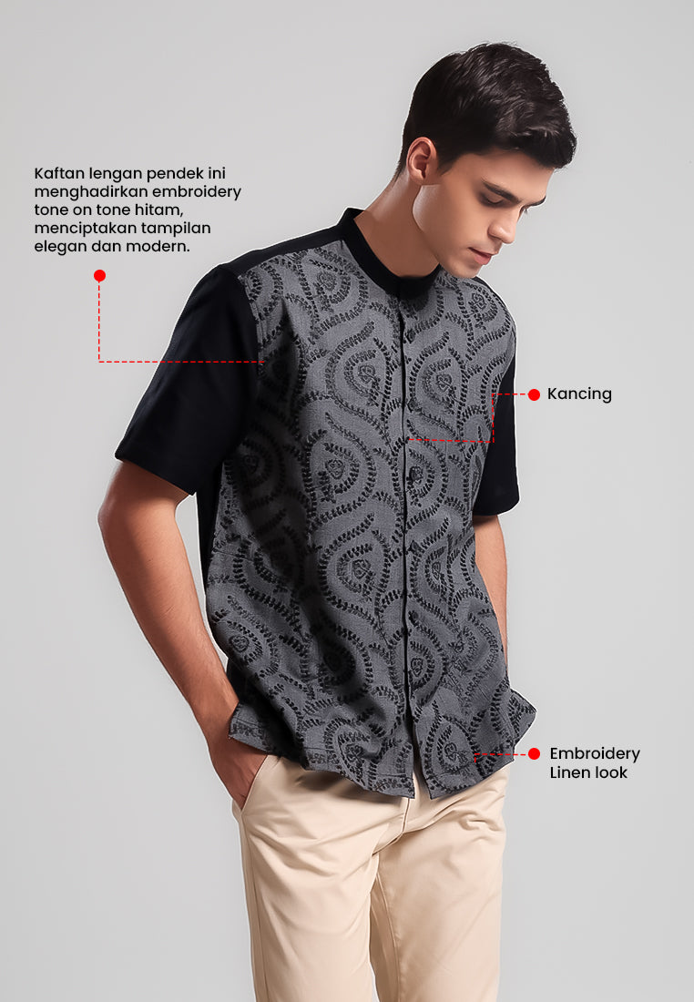Kaftan lengan pendek ini menghadirkan embroidery tone on tone hitam dengan base hitam chambray pada bagian depan, menciptakan tampilan elegan dan modern. Bagian belakang dan lengan dibuat solid hitam untuk kesan yang lebih clean dan minimalis.