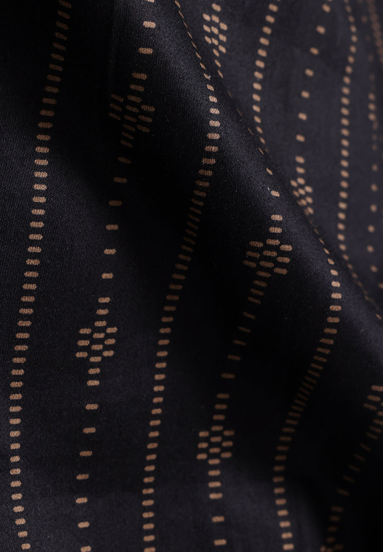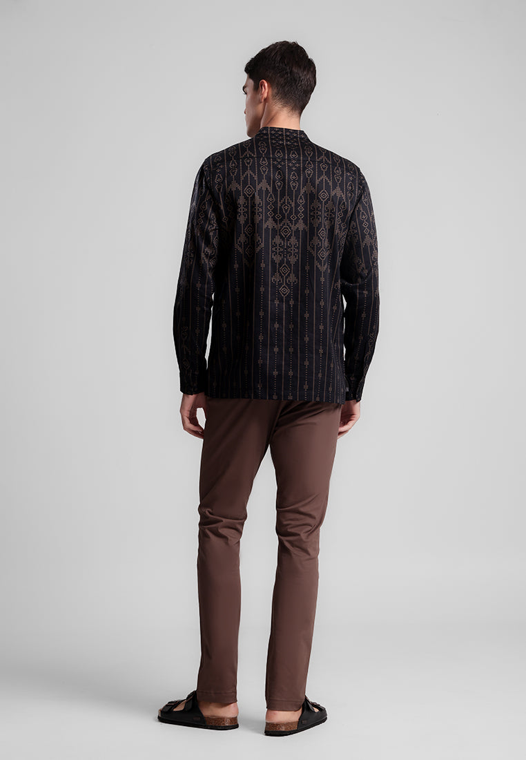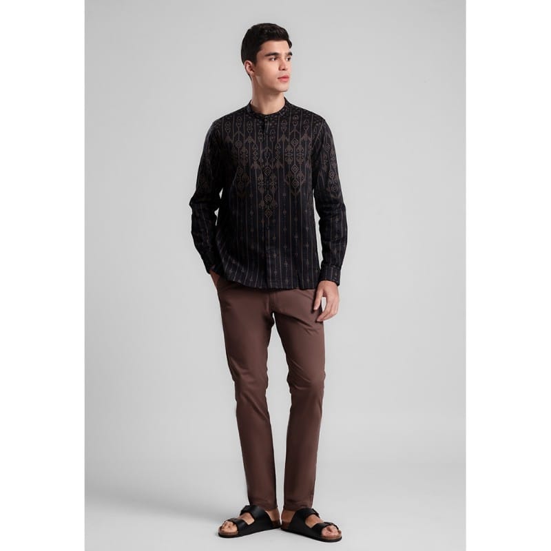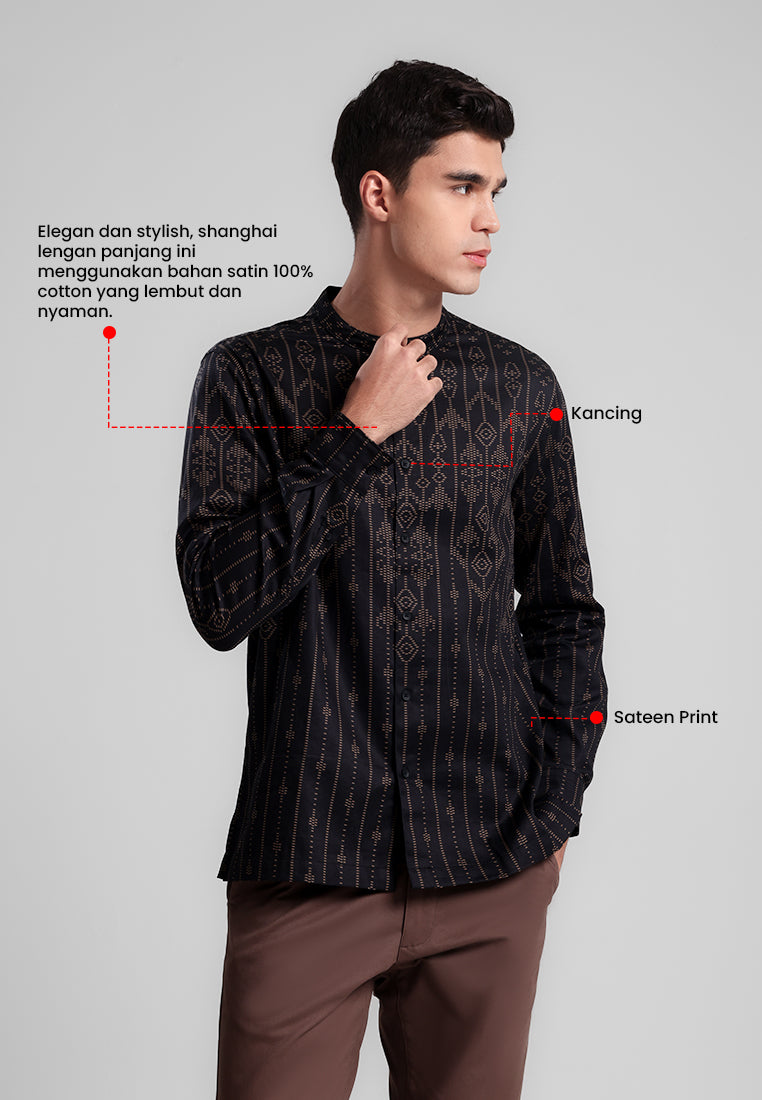 Elegan dan stylish, shanghai lengan panjang ini menggunakan bahan satin 100% cotton yang lembut dan nyaman. Didesain dengan motif etnik berornamen khaki gelap di atas base warna hitam, memberikan kesan mewah dan berkarakter.