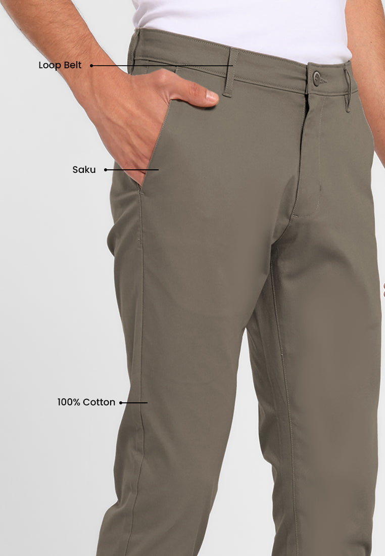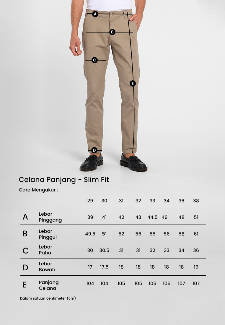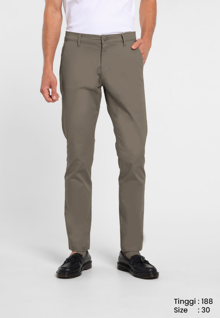 Celana chinos berbahan Twill Spandex dengan komposisi 97% cotton dan 3% spandex. Kain terasa nyaman, tidak kaku, dan memiliki elastisitas ringan. Potongan slim fit memberikan tampilan rapi, modern, dan tetap fleksibel untuk aktivitas harian maupun gaya semi-formal.