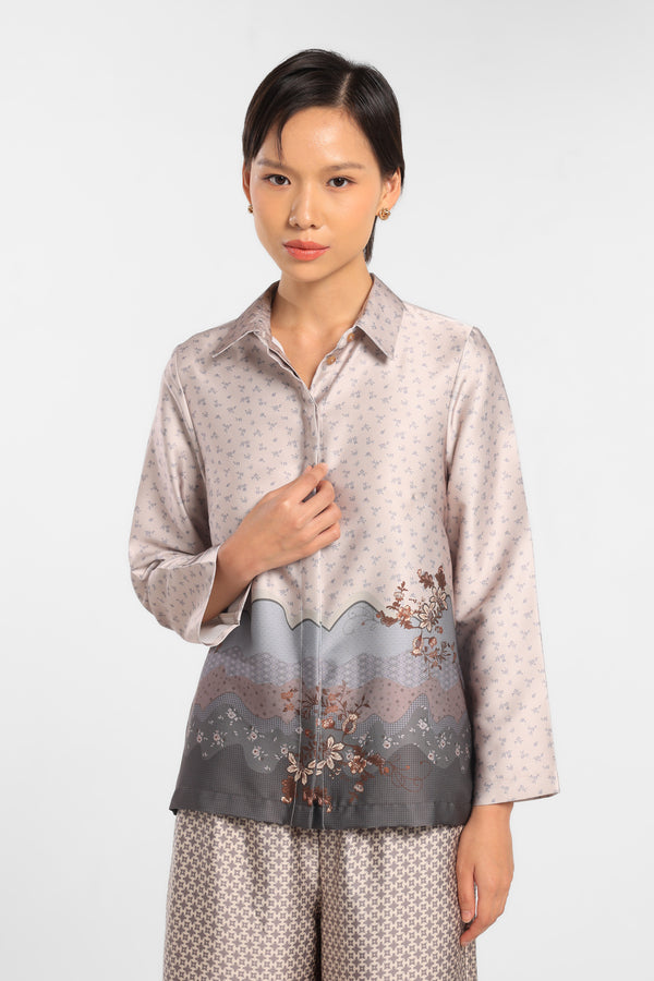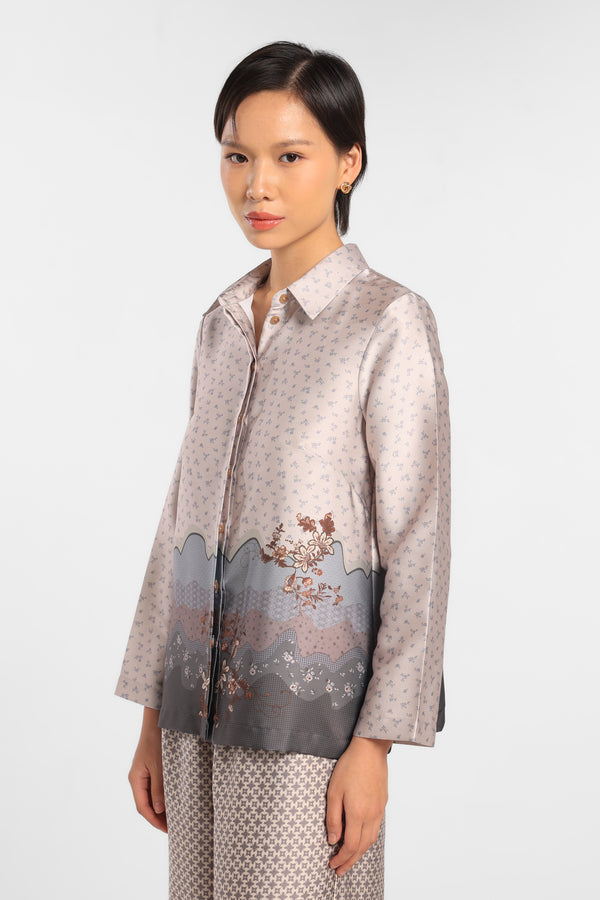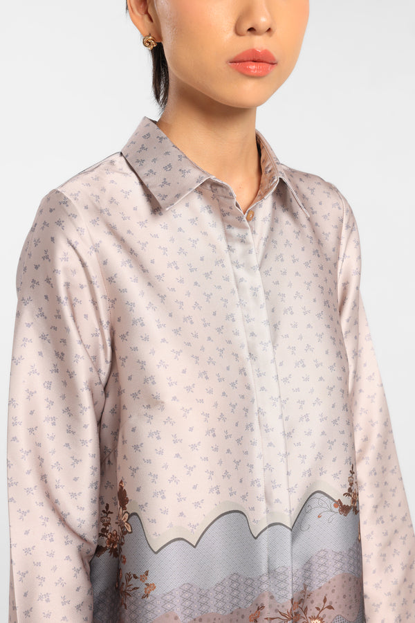 Kemeja Printed dengan motif Eksklusif dirancang dalam komposisi warna Beige lembut.