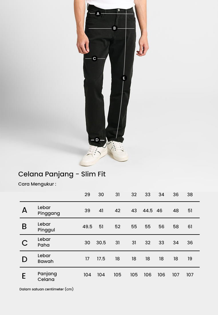 Celana Slim-Fit berbahan twill spandex yang ringan, adem, dan elastis. Dilengkapi karet pinggang untuk kenyamanan maksimal dan fit di badan. Material 60% Cotton, 37% Polyester, 3% Spandex membuat celana tetap fleksibel, tidak kaku, dan terlihat rapi.