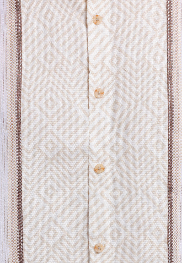 Kemeja koko lengan panjang dengan border di bagian atas body membentuk vertikal, cut & sew kombinasi embroidery. Placket non kansai, terdapat 2 kantong di sisi samping.