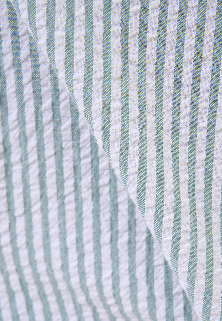 Kemeja lengan panjang ini menggunakan bahan seersucker dengan yarn dyed stripes.